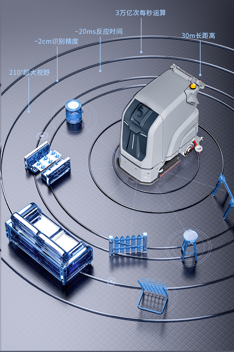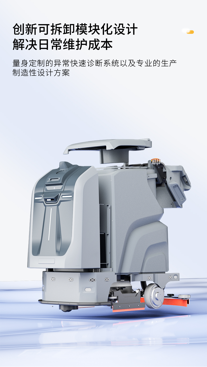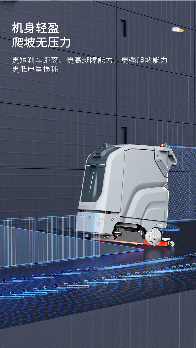 橙犀靈犀1號 無人式洗地機 :靈犀1號擁有最佳通過性,身寬58cm,整機的重量最輕,凈重在200kg以內,新技術加持,三維成像,不同場景可以快速建圖使用??梢允褂眯聫V角3D TOF模組,全智能導航。